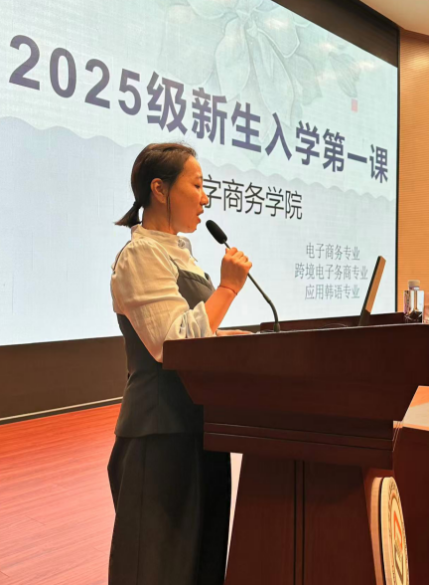 为帮助新生快速适应大学学习生活、明确专业发展方向,2025年9月25日,数字商务学院针对 2025 级电子商务、跨境电商、应用韩语三个专业新生200余人,开展 “新生第一课” 主题教育。数字商务院长栾雅春、副院长王娅婷,专业教研室主任及三位行业企业家共同参与,通过行业视角分享、专业解读与互动交流,为新生打造了一堂兼具思想引领与实践指导的 “开学必修课”。会议由应用韩语专业教研室主任张虹霞主持。